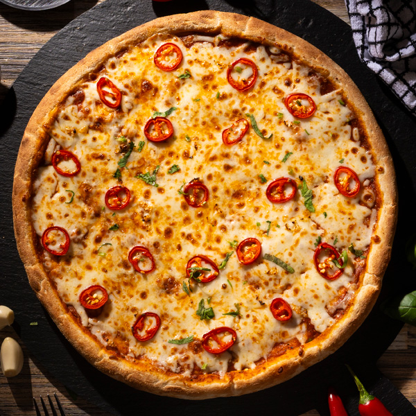 Spicy masala base with a sprinkle of green chillies, fresh garlic then loaded with mozzarella and topped with red chillies! A perfect blend of spice and cheese!