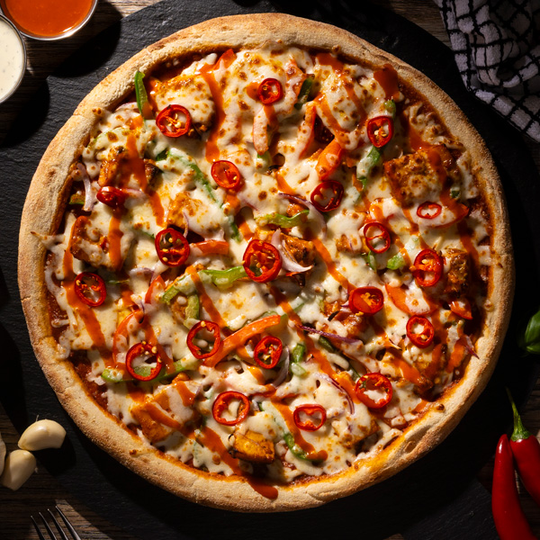 Our best selling vegetarian pizza! Spicy masala base, sautéed chilli paneer, red onions, mixed peppers, mozzarella, red chillies and finished with fresh coriander