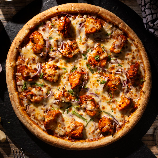 Succulent tandoor-grilled chicken tikka cooked in rich, creamy masala sauce, topped with red onions, mozzarella, and fresh coriander. The perfect blend of smoky, spicy, and comforting flavours. Contains Nuts.