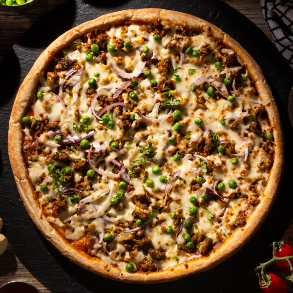 Lamb keema, masala spices, peas, red onions, mozzarella, topped with coriander.